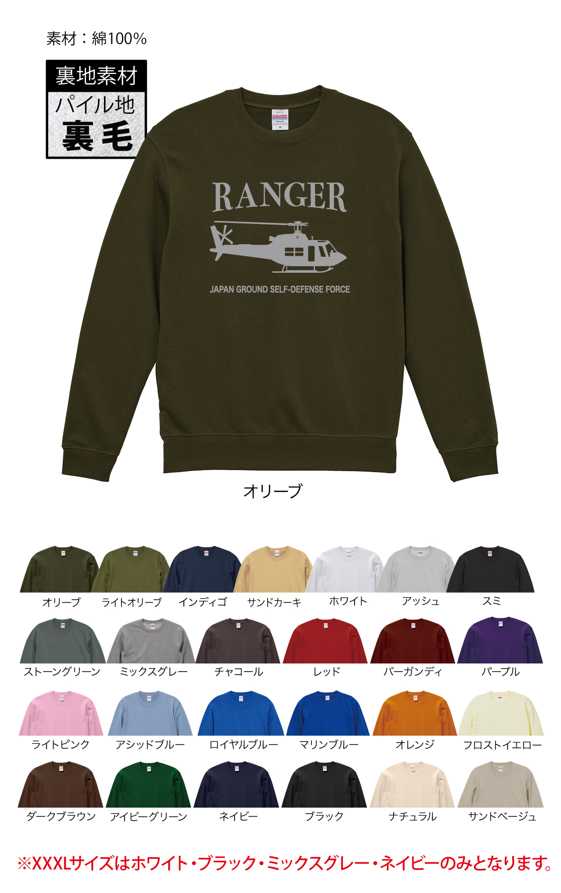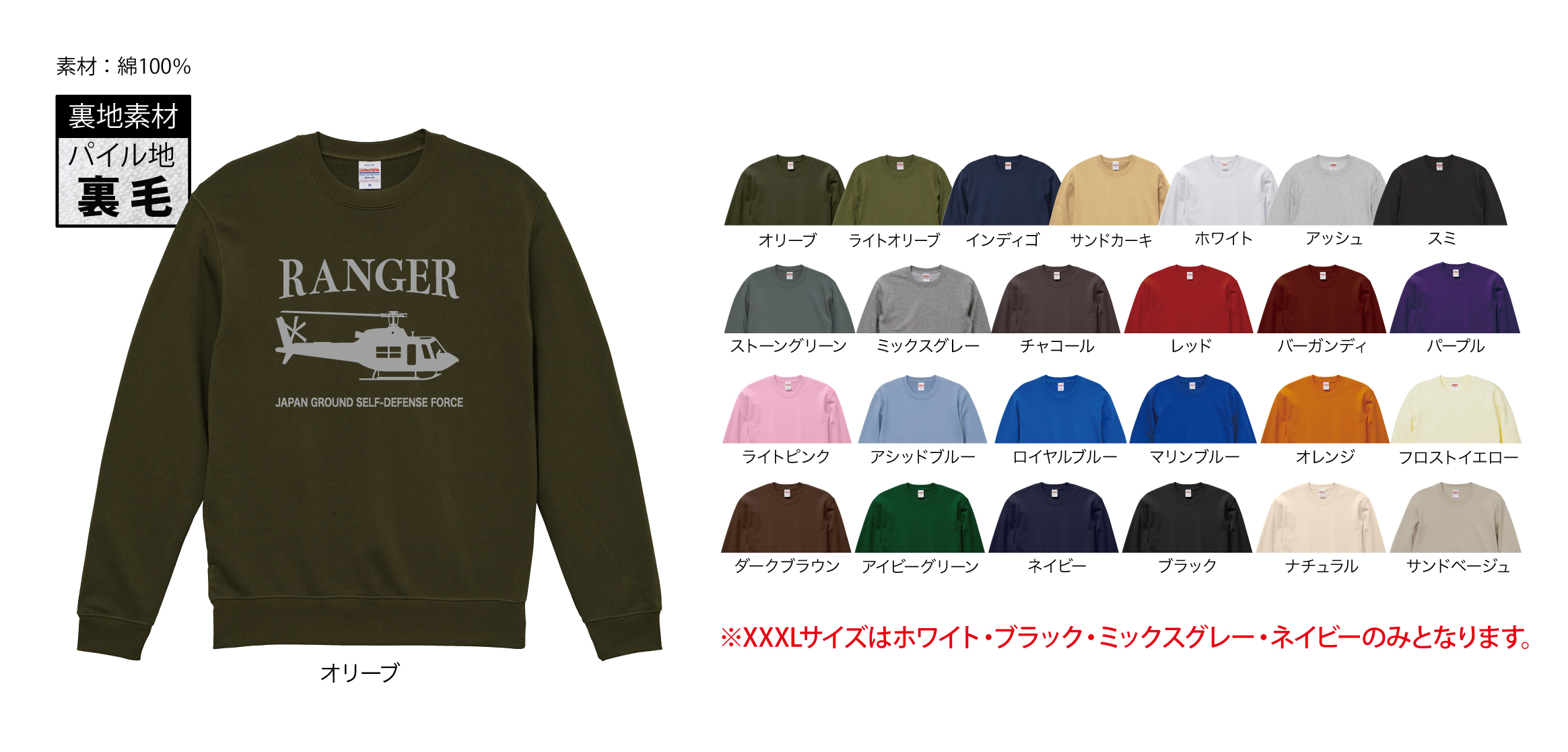 ※XXXLサイズはホワイト・ブラック・ミックスグレー・ネイビーのみとなります。